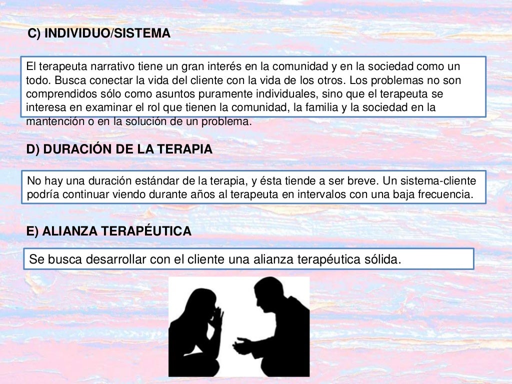 34 ¿Cómo funciona la terapia narrativa? (2003) caracterizan a las terapias y a los terapeutas postmodernos de la siguiente manera: Todo conocimiento es una construcción, una construcción que está inmersa en una cultura. Por lo tanto, la terapia eficaz requiere - y es normal que lo haga - discursos múltiples, incluyendo el cultural.