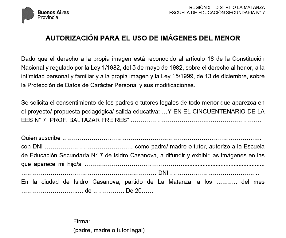 La solicitud de autorización para tomar y publicar imágenes de menores se ha de redactar desde el Colegio, y ha de ser clara y con un contenido mínimo. Así pues, en este modelo de consentimiento ha de constar: Los datos de los padres o tutores legales del menor. Explicar a quién se ceden los derechos del uso de la imagen, así como para.