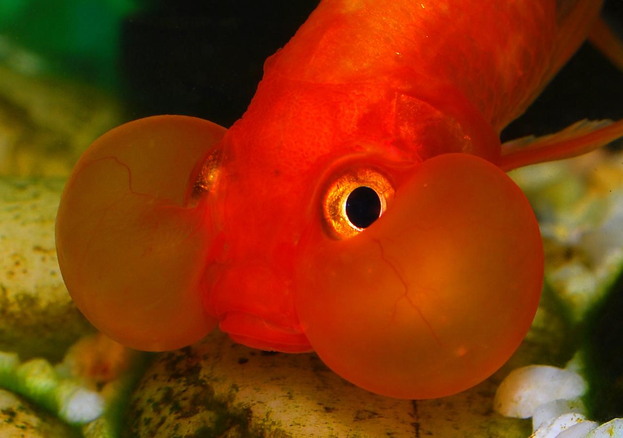 Goldfish ojos de burbuja. Pez originario de China, forma parte de la variedad de peces rojos, y es uno de los peces mas atractivos, bajo cada ojo tienen en suspensión una vesícula llena de líquido. Tienen el cuerpo alargado y carecen de aleta dorsal. Las vesículas pueden ser de diversos tamaños y grosores, estos peces aparecen por primera vez en China en 1908.