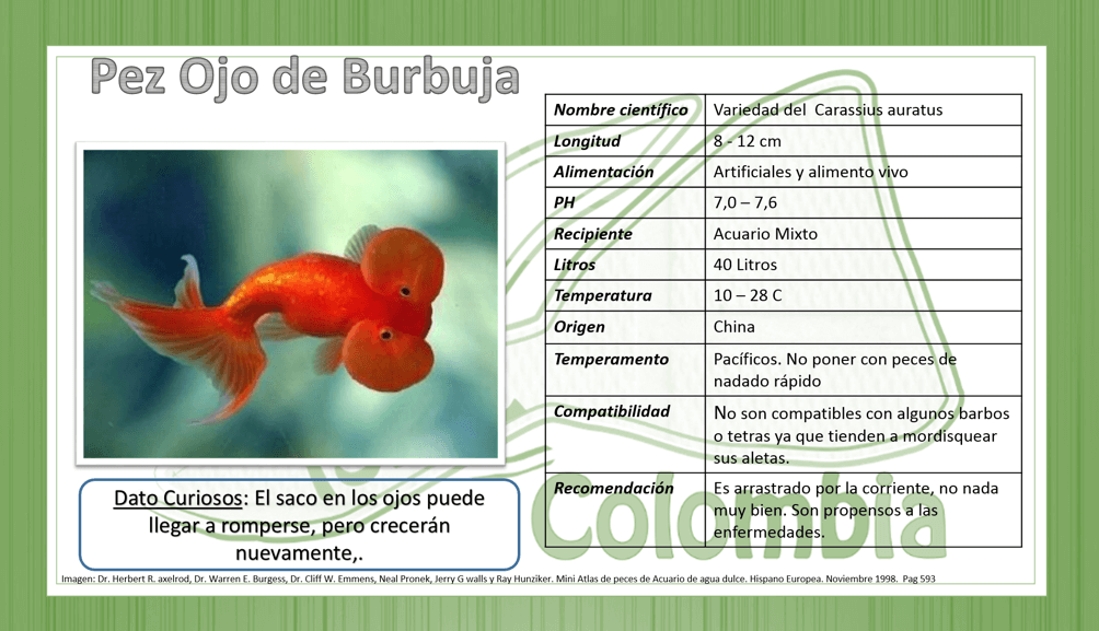 Los peces ojo de burbuja son originarios de China y son parte del tipo de los Goldfifs, pero debido a sus grandes ojos necesitan de cuidados especiales, como estar en una pecera redondeada y sin filos para evitar que se dañen las bolsas de sus ojos. Nombre común: Ojos de Burbuja. Los ojos en si son de apariencia normal, sin embargo en la mitad de los casos, los sacos crecen tanto que los.