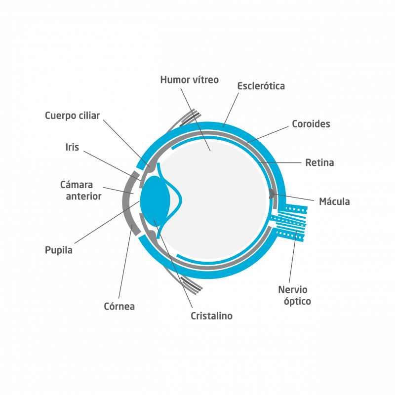 La primera está formada por la conjuntiva, una membrana mucosa que ayuda a lubricar el ojo ocular; la córnea, una capa de células epitaliales; el iris, la pupila y el cristalino. La parte posterior está conformada por el humor vítreo, un gel transparente que ocupa la mayor parte del ojo y la retina, que es la parte sensible a la luz.