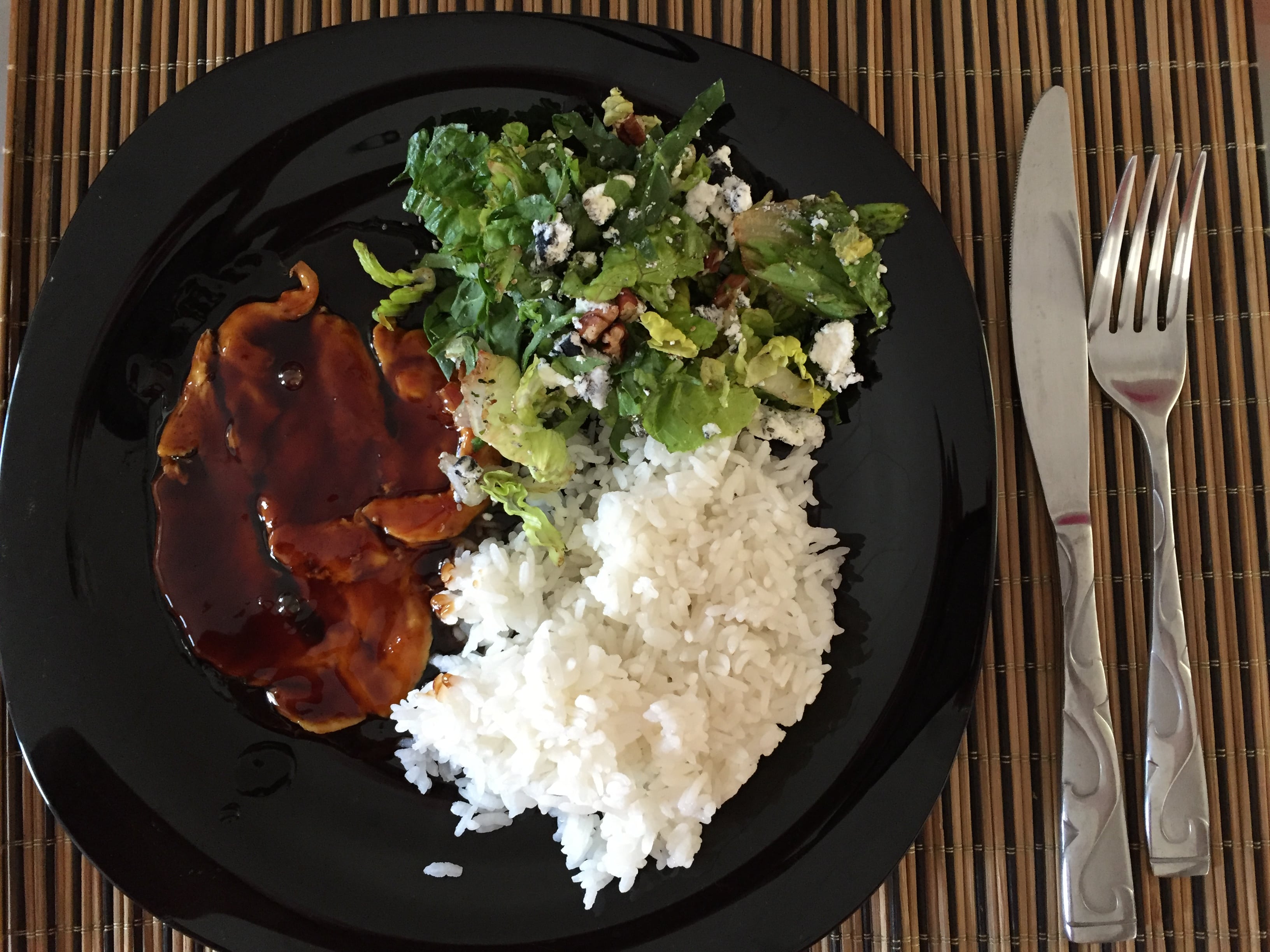 Con abundante salsa teriyaki, barnizamos el costillar de cerdo, lo enrollamos con plástico de cocina y dejamos marinando toda la noche. Horneamos el costillar en una fuente de horno a 160º durante 1 hora, dándole la vuelta cada 15 minutos y añadiendo la salsa teriyaki que quedase en la fuente o añadiendo un poco más si fuera necesario.