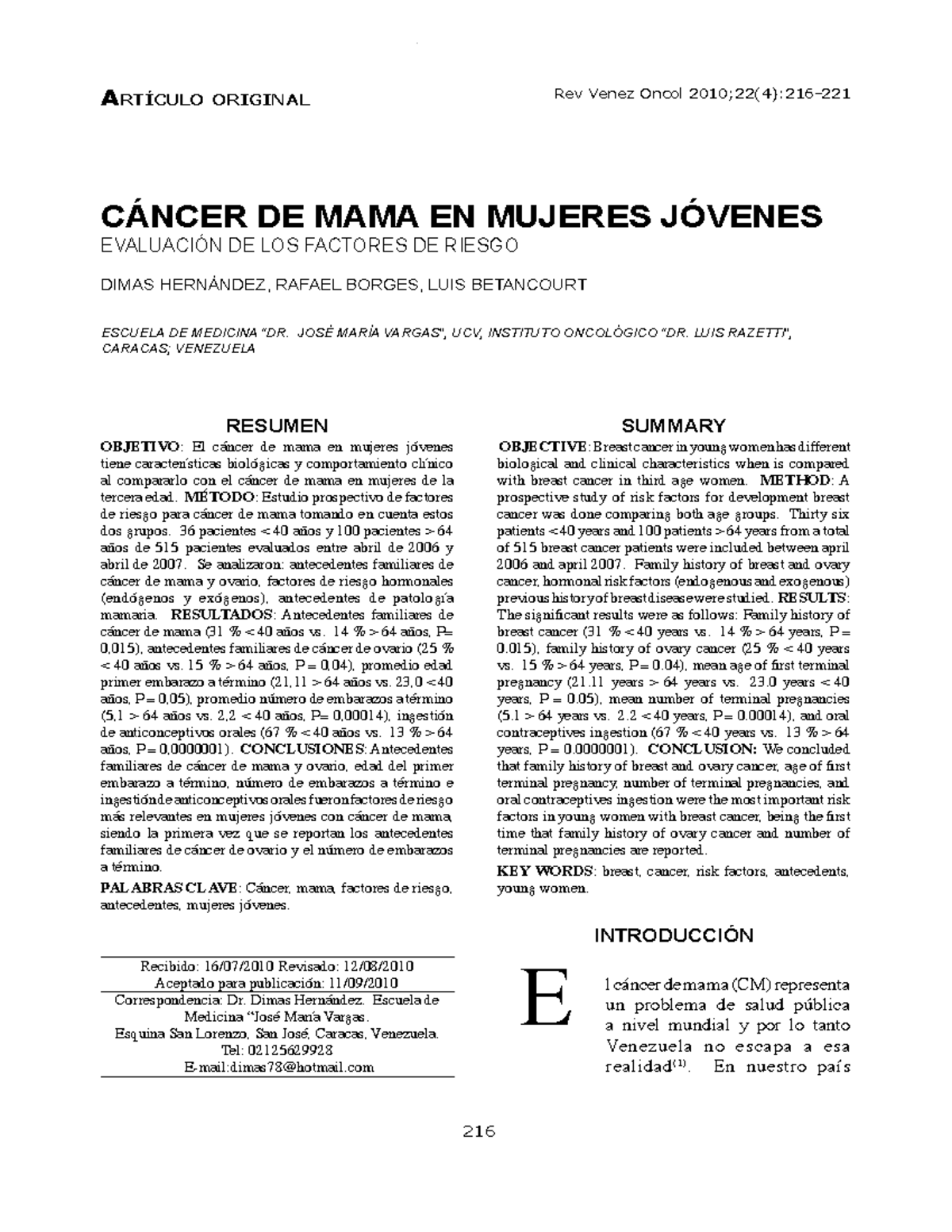 CA de mama en mujeres jovenes Vol. 22, Nº 4, diciembre 2010 CÁNCER DE MAMA EN MUJERES JÓVENES