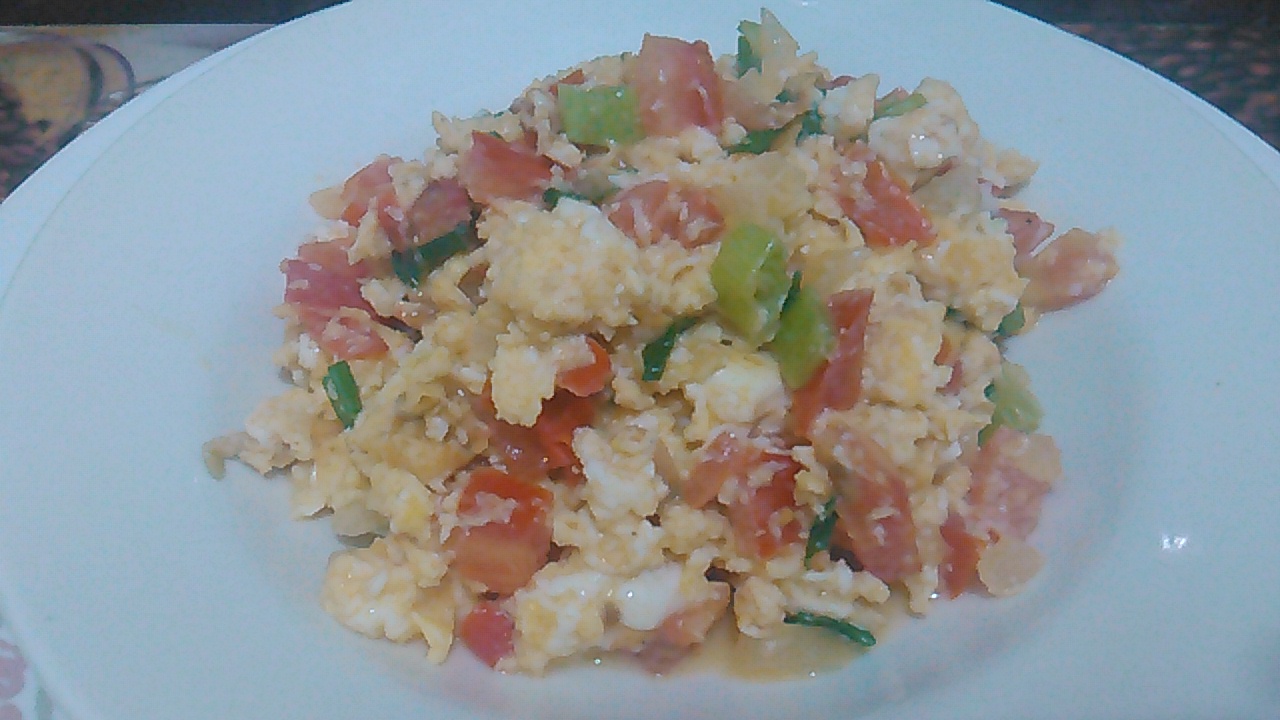 Heat the oil in a skillet and cook the scallions and peppers over medium heat for 4 minutes, stirring regularly. Add the tomato and sauté again for 4 minutes, stirring regularly. In a bowl, mix the eggs very lightly with water. Add the eggs to the pan. Season with salt and pepper and stir until the eggs are cooked.
