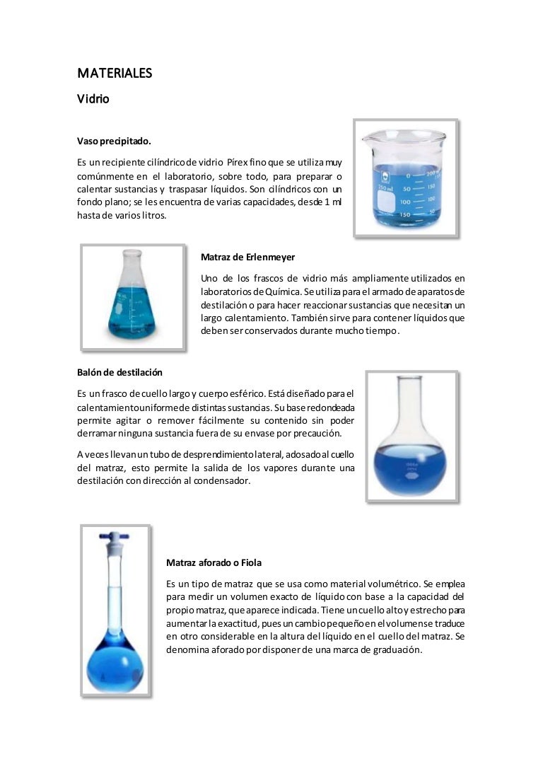 Los materiales de vidrio son los más comunes en un laboratorio. Estos materiales se utilizan para contener, medir y manipular líquidos y gases. Algunos ejemplos de materiales de vidrio son los tubos de ensayo, las pipetas, las buretas, los matraces y los erlenmeyers. Cada uno de estos materiales tiene una función específica, por ejemplo.