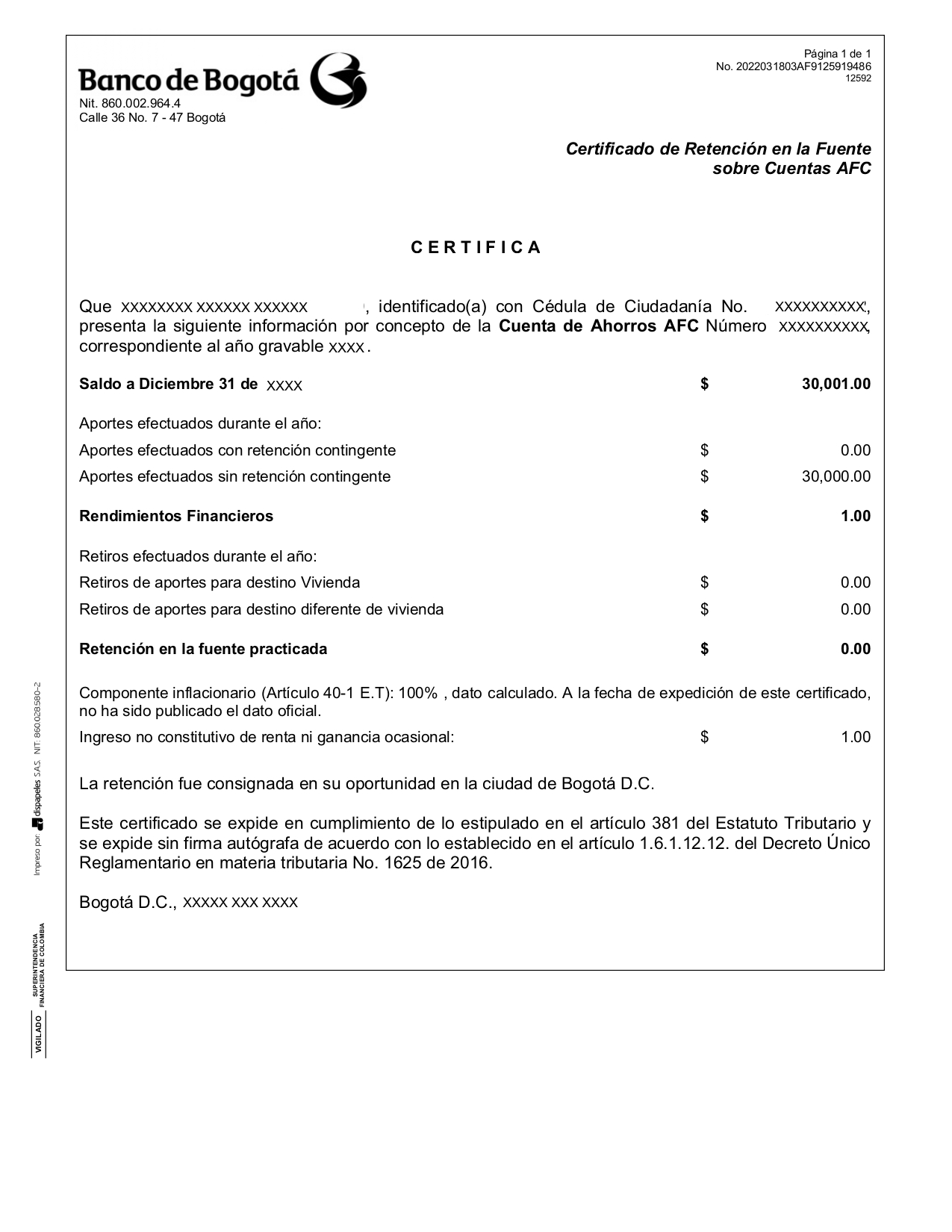 Certificado para declaración de renta de cuenta de ahorros AFC del Banco de Bogotá Tributi