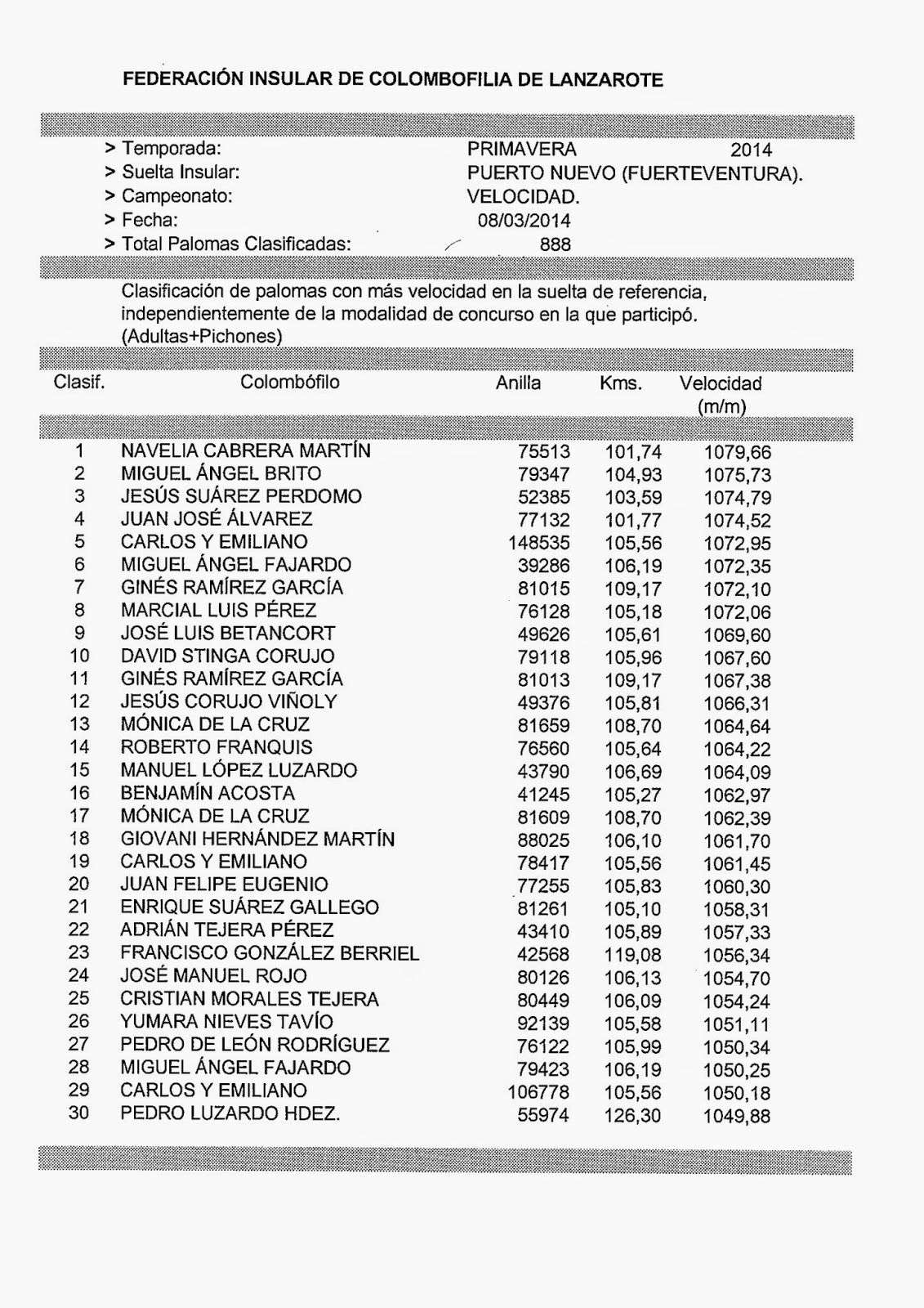 Federación Insular de Colombofilia de Lanzarote Suelta Insular Pto. NuevoTOP 30.