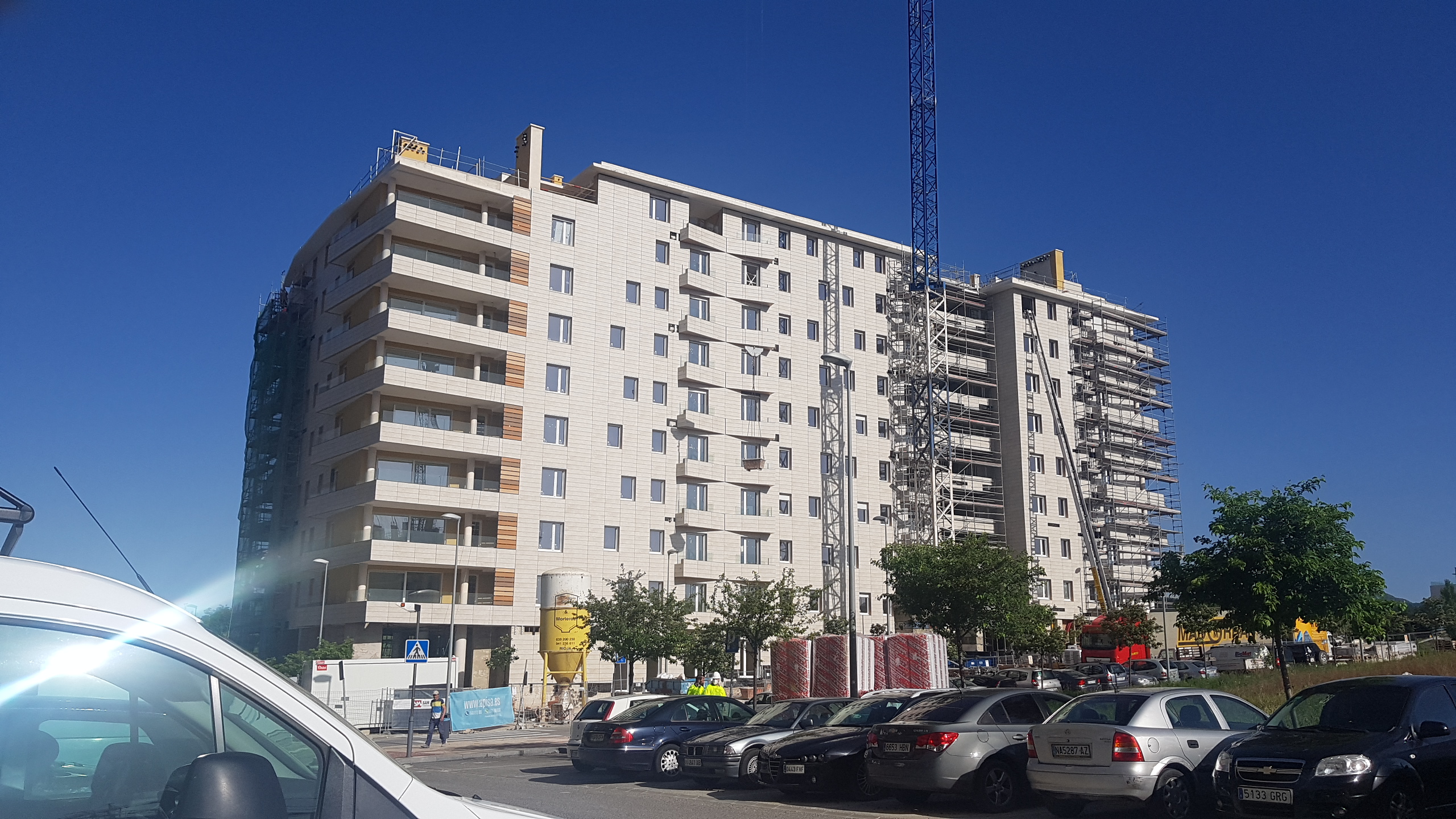 Soto de la Marina. Fachadas, patios, terrazas, áticos. la obra de Edificio Zafiro va tomando forma definitiva. Se están iniciando los trabajos de equipamiento para la instalación.