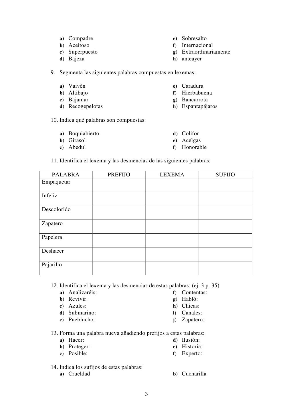 9. Segmenta las siguientes palabras compuestas en lexemas: a) Vaivén b) Altibajo c) Bajamar d) Recogepelotas e) Caradura f) Hierbabuena g) Bancarrota h) Espantapájaros 10. Indica qué palabras son compuestas: a) Boquiabierto b) Girasol c) Abedul d) Colifor e) Acelgas f) Honorable 11. Identifica el lexema y las desinencias de las siguientes.