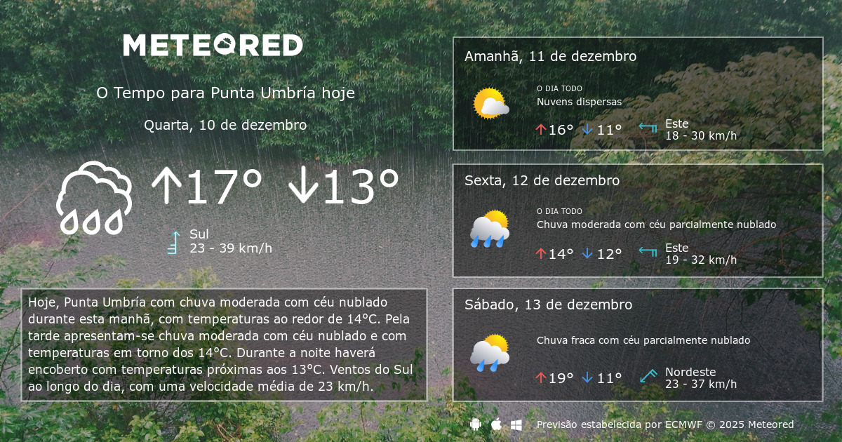 Este sitio web utiliza cookies propias y de terceros para mejorar la experiencia de navegación, y ofrecer contenidos y funcionalidades de interés.. Download the XML archive of the detailed weather forecast for Punta Umbría. XML Tue 30 Wed 01 Thu 02 Fri 03 Sat 04 Sun 05; 00-06 h. 10°C. 06-12 h. 17°C. 12-18 h. 17°C. 18-24 h. 15.