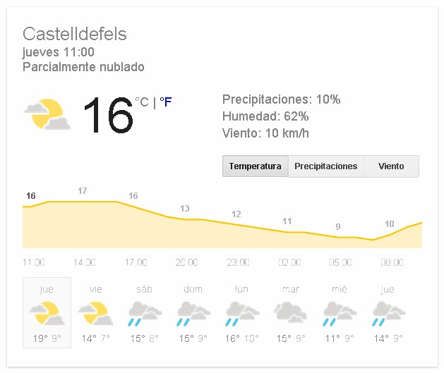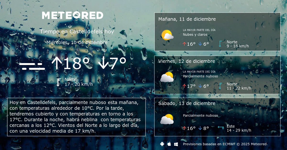 El Tiempo. Predicción para los municipios españoles: Castelldefels (Barcelona) - Predicción 7 días - Tabla. El tiempo en tu web;. Capital: Castelldefels (altitud: 3 m) Latitud: 41° 16' 43'' N - Longitud: 1° 58' 36'' E - Posición: Ver localización Zona de avisos: Litoral de Barcelona. Descargar XML de la predicción detallada de.