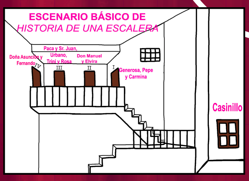 historia de una escalera EL ESCENARIO: Aspecto general El escenario de esta obra se corresponde con el interior de un edificio de pisos. El elemento primordial es una escalera, dos rellanos y cuatro puertas en la parte superior.
