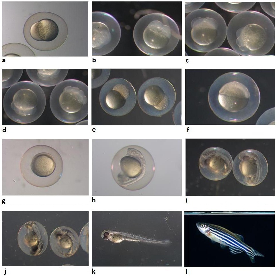 Etapas del desarrollo embrionario de Danio rerio. La fecundación en el pez cebra es externa: la hembra expulsa los huevos al agua y el macho libera su esperma sobre ellos. Puedes aprender más sobre la reproducción de Danio en este enlace.
