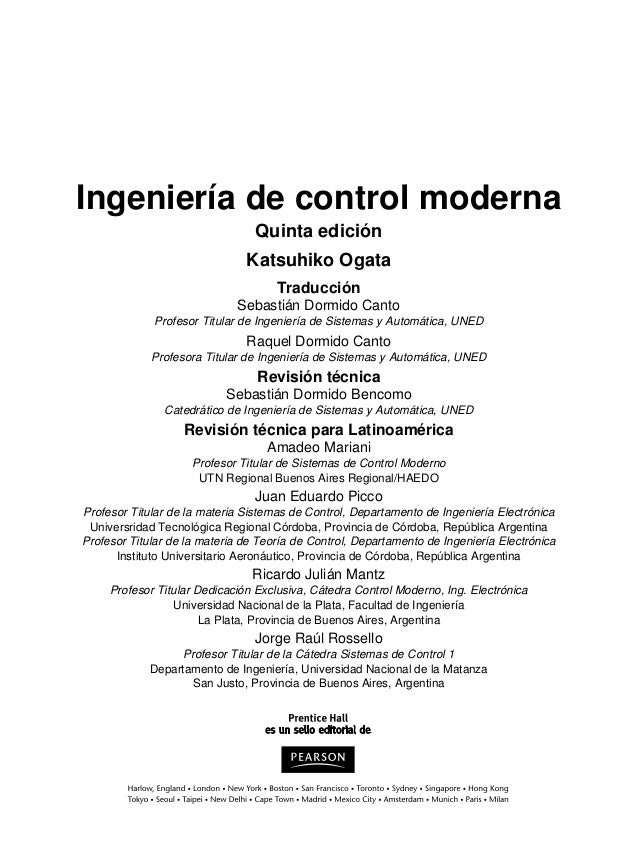 Books. Ingeniería de control moderna. Katsuhiko Ogata. Pearson Educación, 2003 - Science - 965 pages. CONTENIDO: Introducción a los sistemas de control - La transformada de Laplace - Modelado matemático de sistemas dinámicos - Modelado matemático de sistemas de fluidos y sistemas térmicos - Análisis de la respuesta transitoria y.