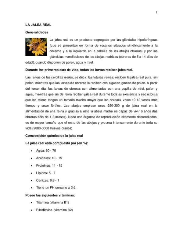 La jalea real es una sustancia viscosa, de un suave color amarillo y sabor ácido segregada por las abejas obreras jóvenes, de entre 5 y 15 días de vida, que mezclada con secreciones estomacales, sirve de alimento a todas las larvas durante los primeros tres días de vida. Solo la abeja reina y las larvas que darán origen a una nueva reina.