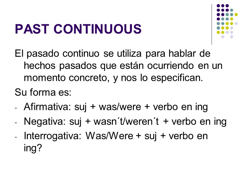 Diferencias entre past simple y past continuous. El past continuous tiene claras diferencias con el past simple (pasado simple), las cuales se pueden resumir de la siguiente forma: El pasado simple es para acciones que empezaron y terminaron en el pasado. El pasado continuo se usa para acciones que se estaban llevando a cabo en el pasado. Ejemplos: