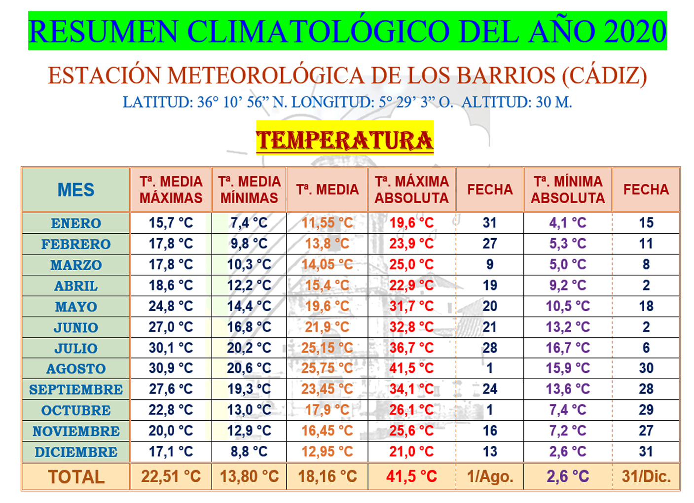 INFOMETEOLOSBARRIOS TABLARESUMEN CLIMATOLÓGICO ANUAL. AÑO 2020. Los Barrios (Cádiz)